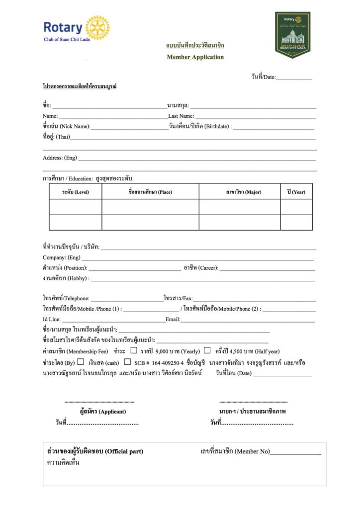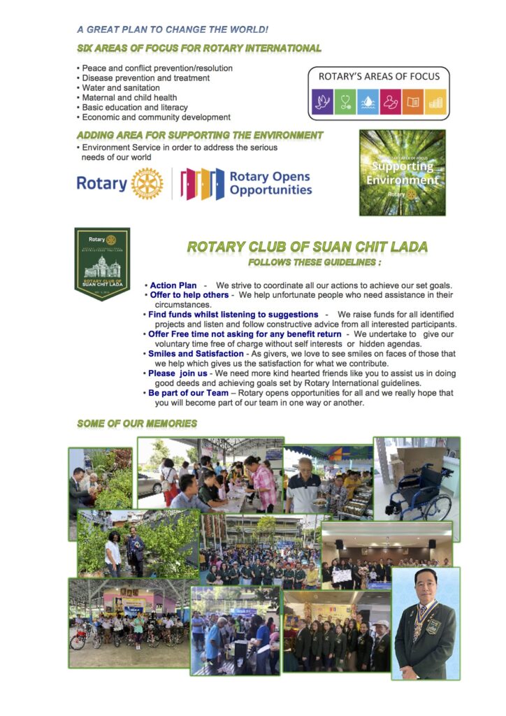 Brochure and Application ขอเชิญทุกท่านที่สนใจในการร่วมทำกิจกรรมบำเพ็ญประโยชน์ เพื่อสาารณะ อันเป็นการช่วยเหลือและส่งเสริมคุณภาพชีวิตของชุมชนและเยาวชน ตลอดจน สิ่งแวดล้อม ตามหัวข้อหลักที่ทางโรตารีให้ความสนใจ เช่น โครงการที่ทำต่อเนื่องเพื่อที่จะกำจัด โปลิโอ ให้หมดไปจากโลกนี้ , เรื่องคุณภาพน้ำดื่ม , คุณภาพชีวิต , ลดโรคภัยต่างๆที่เกิดขึ้น อย่างที่เราเผชิญในตอนนี้ เช่น ไวรัสโควิด-19 เป็นต้น เมื่อเรารวมพลังกันทำกิจกรรม ทุกอย่างย่อมประสพความสำเร็จ